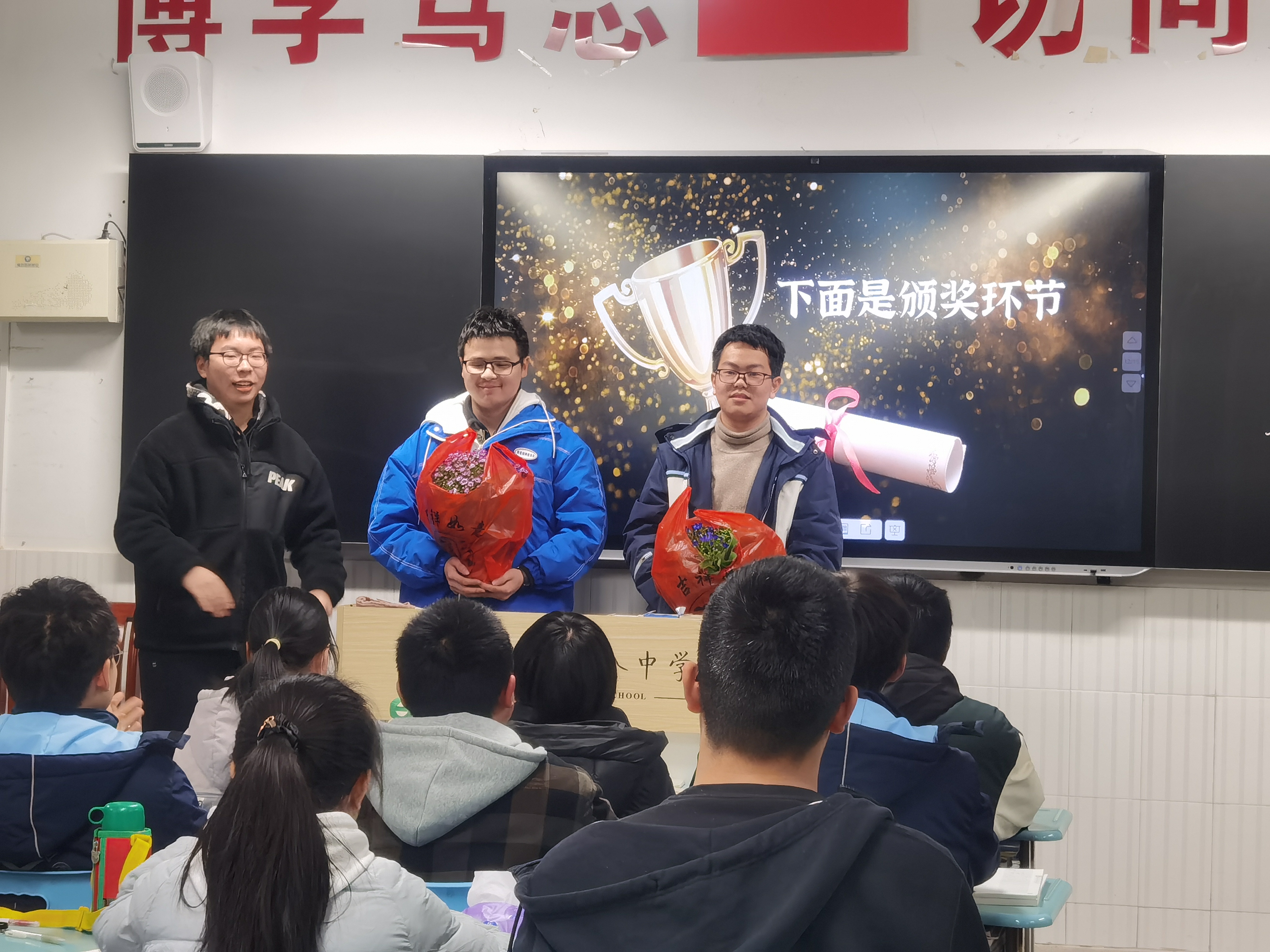 欢声笑语,盈满班级。班会伊始,主持人赵宇扬同学以轻松愉快的语调向同学们介绍何为“向阳而生,向善而行”——自当是心态保持阳光,品行止于至善。在心态上,主持人以抑郁症为切入点,强调了保持良好心态的重要性,在无常的生活中热爱一切。而在品行方面,则通过“第二届高一(19)班优秀学生表彰大会”这一特别的方式表达出来:伴随着主持人庄重而富有激情地朗读颁奖词,本班绿植委员周文轩与多媒体管理员周辛喆上台接受表彰,并得到主办小组精心准备的奖品——两盆花草。我想,这一榜样的力量更加直观地鼓舞了19班学子“向善而行”,而特殊的奖品也恰恰与“向阳而生”之主题相契合。班上一时间温情脉脉。