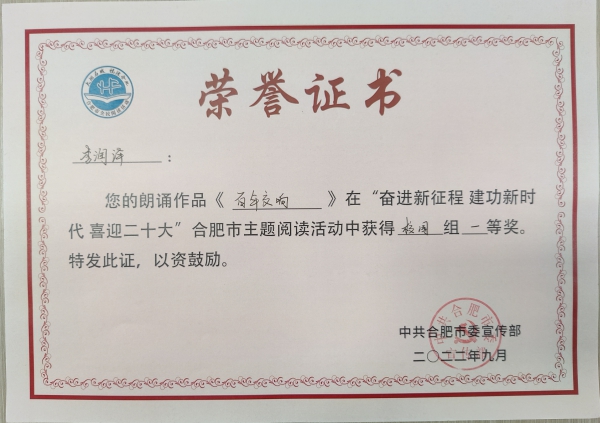 ——合肥一六八中学高二年级学生获得市级朗诵一等奖