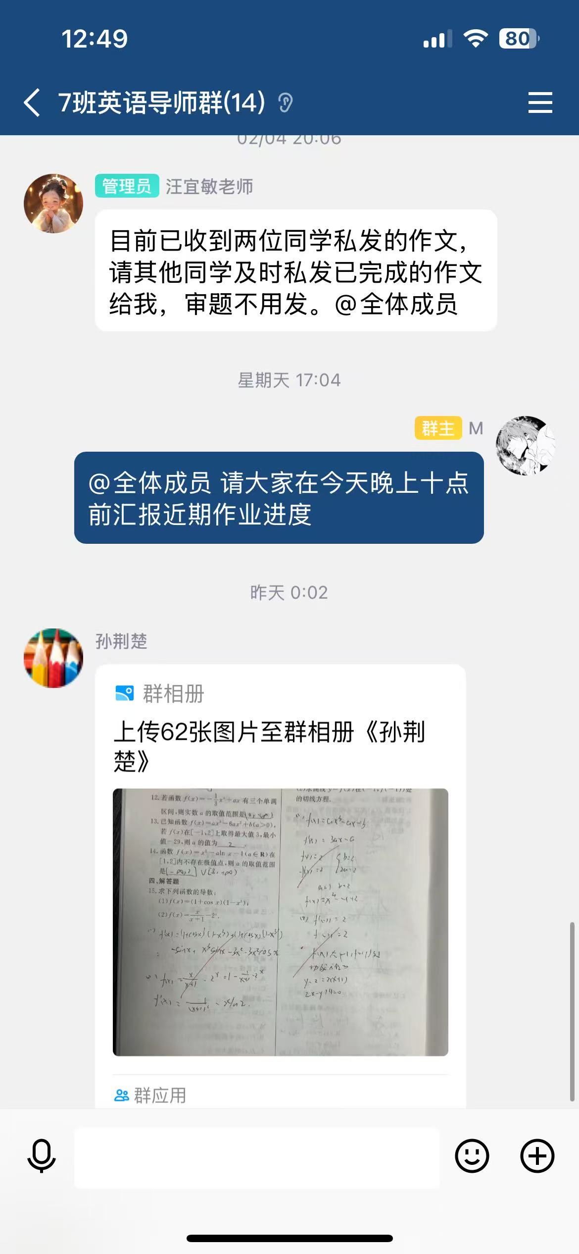 寒假伊始,班级成立以班主任为核心的“学业导师小组”,将全班分为六个学习互助组,由任课教师担任导师。导师们每周通过线上会议检查作业进度,针对薄弱学科开展“一对一答疑”,并制定个性化提升计划。寒假期间,班级作业完成率极高,老师们还以视频的形式为同学们答疑解惑。老师们不仅关注同学们的作业量,更注重学习方法的优化,让同学们学会了如何高效整理错题。