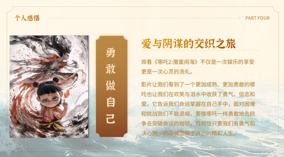 同学们还认为,《哪吒》的成功离不开制作团队的日夜奋斗,制作团队对品质的追求是电影成功的关键因素之一。它提醒我们,无论是在哪个行业,都要树立品质意识,掌握核心关键技术,实现不断创新。