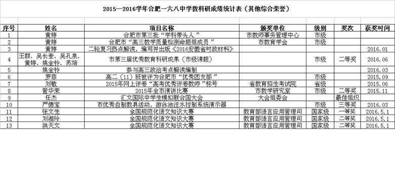 2015-2016学年合肥一六八中学教师获奖情况统计