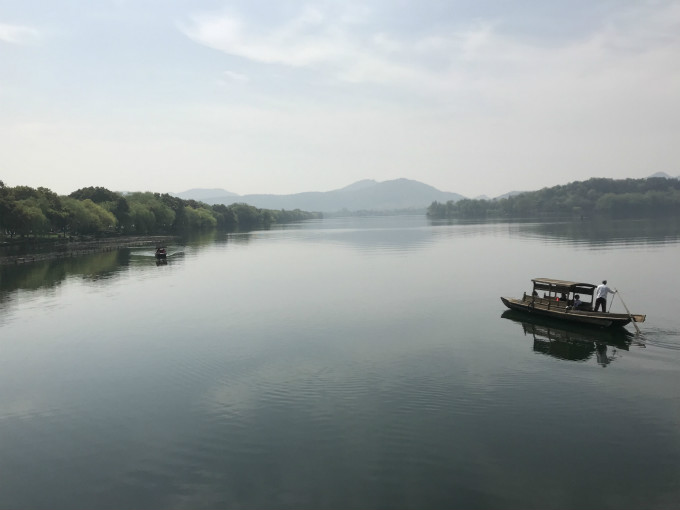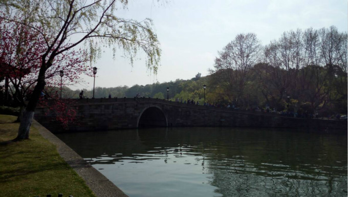 西湖的美景让我们从对于岳飞的感叹中走出,尽情的拥向这如天堂一般的景色中去。“上有天堂,下有苏杭。”常有人讲这句话,可没来过杭州的人也不免心生疑惑,这杭州真如天堂般那么美吗?而当同学们看到这西湖美景时如痴如醉的表情显然是给出了肯定的答案。走进西湖,一眼望去给人以山河撞击之秀美之感。远处似幻非幻的青山,连绵起伏;眼前波光荡漾的湖水轻轻漾着微波,好似江南女子温柔的双手在一遍遍轻抚着湖岸。这挺拔壮阔与清丽优雅的结合,给人以似被带入人间天堂的感觉,如梦如幻。岸边轻轻荡起枝条的杨柳,水面随风漂流的小舟,让人不由想起许仙与白娘子的爱情故事,给西湖又蒙上了一层神秘浪漫的面纱。