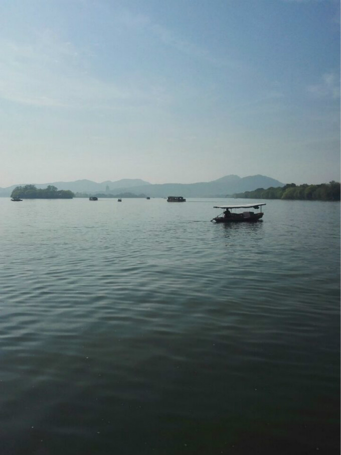 “未能抛得杭州去,一半勾留是此湖。”白居易曾在西湖旁留下的感慨,如今也成了此时站在西湖旁的我的心声。站在堤上,一眼望去,湖天一色,清澈的湖水向天空流动着,那湖水仿佛在云彩中流淌。行走于西湖的白堤上,阳光所带来的燥热与内心的浮躁都被湖上的清风所吹散,那些彷徨伤心的事都暂时被丢置一旁,一心只想享受这西湖的美。
