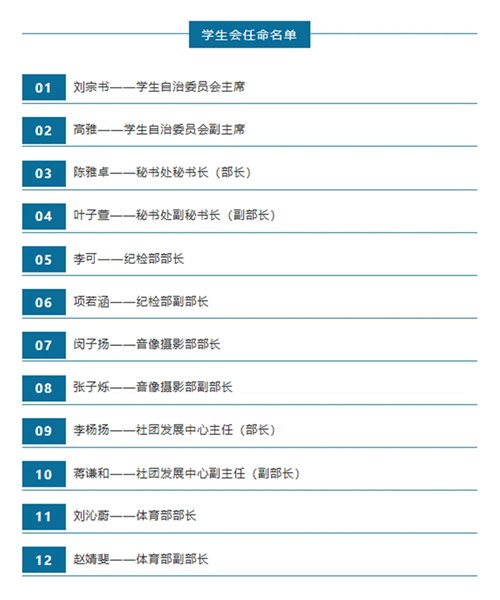 音像摄影部新增人员名单:夏思睿、计于晨、何沛宸、黄文琼、孟紫阳、储容轩、周茉清、满文昊、李应果儿
