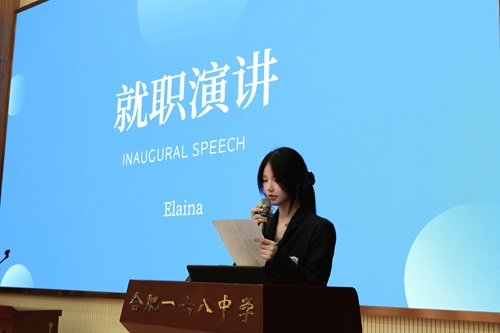 在活动的最后,合肥一六八中学国际部学生会副主席高雅同学发表就职演讲。