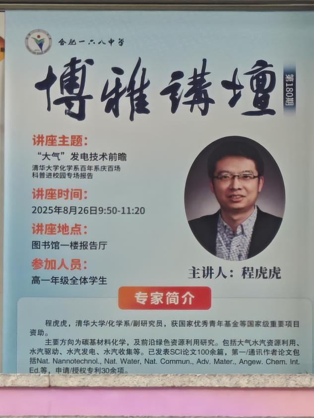 8月26日上午,合肥一六八中学高一年级入学教育正如火如荼地进行,学校精心筹备的“博雅讲坛”迎来一位重磅嘉宾——清华大学化学系副研究员程虎老师,为千余名高一新生带来题为“大气发电技术前瞻”的学术盛宴。
