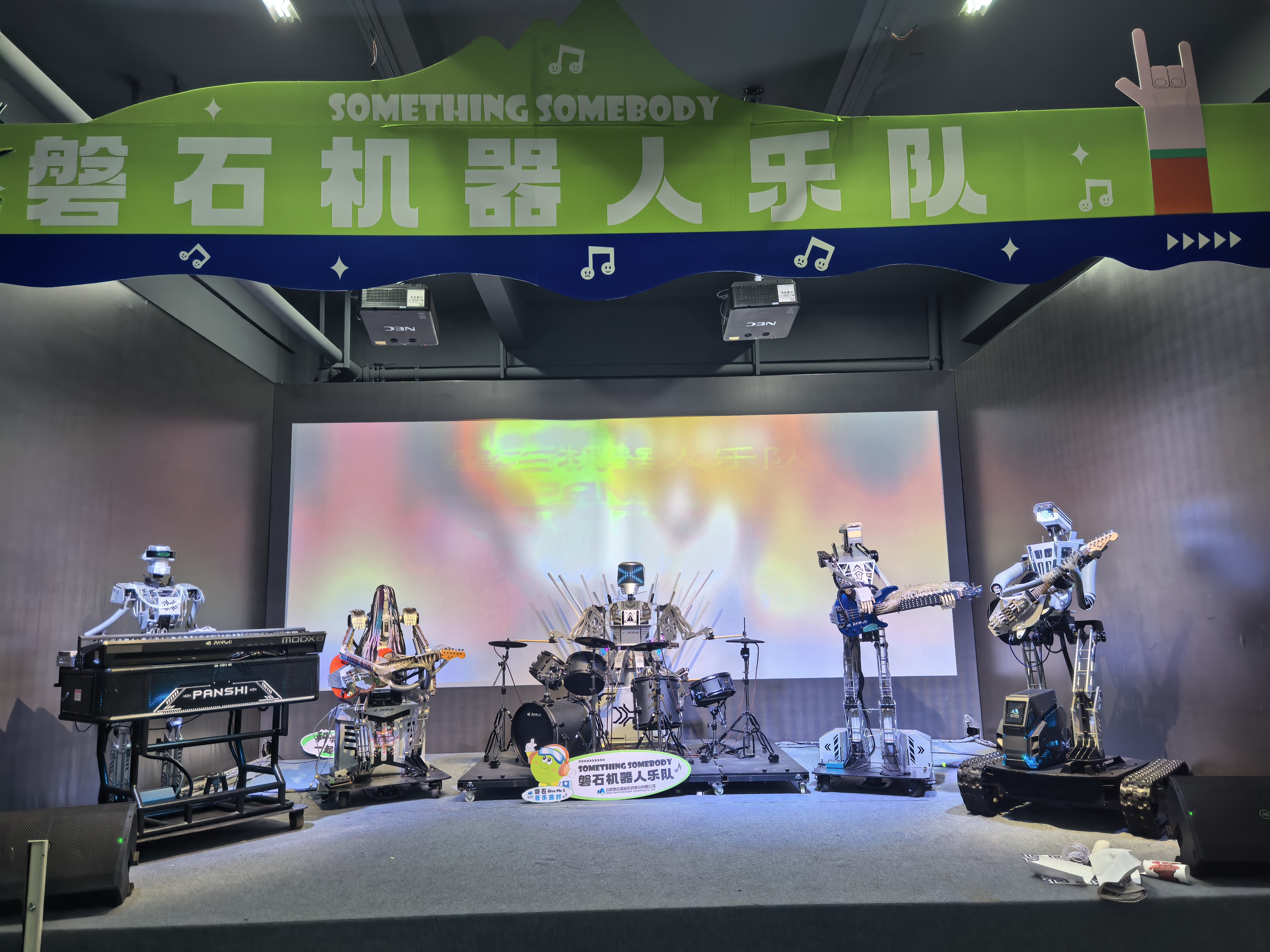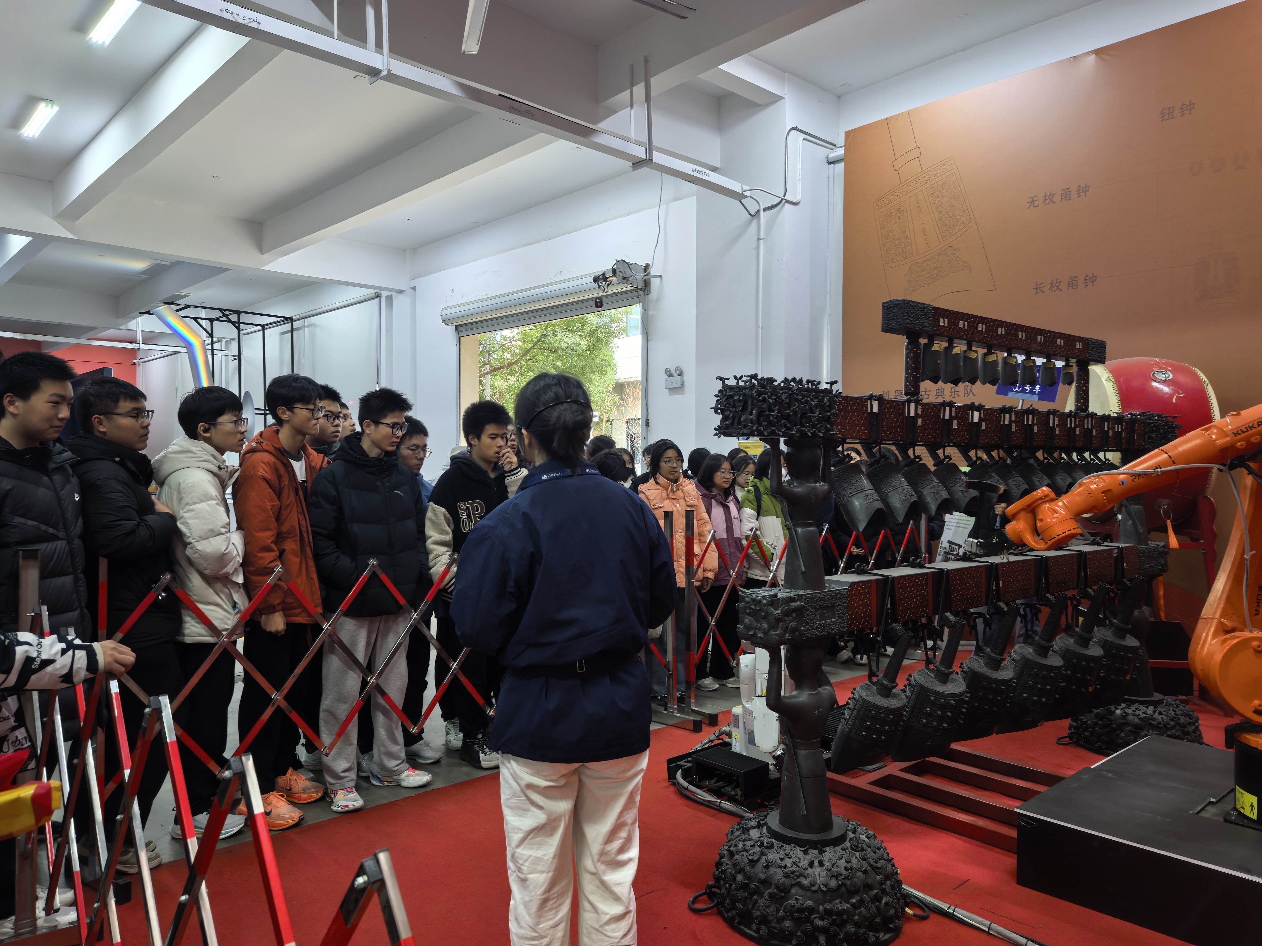 其中,最令同学们难忘的,是自磐石科技机器人乐队的精彩表演。这支历时五年自主研发的“机器人天团”,曾亮相央视与省级春晚,以精密的结构设计和智能算法惊艳全场。讲解员介绍,机器人通过程序控制与协同运算,实现多关节的精准配合,完成演奏、互动等高难度动作。当机器人与同学们共同唱响《孤勇者》时,现场气氛被瞬间点燃,科技的“硬核”与艺术的“温度”在此交汇。