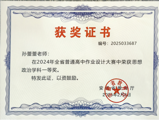 孙蕾蕾老师安徽省普通高中作业设计大赛一等奖证书