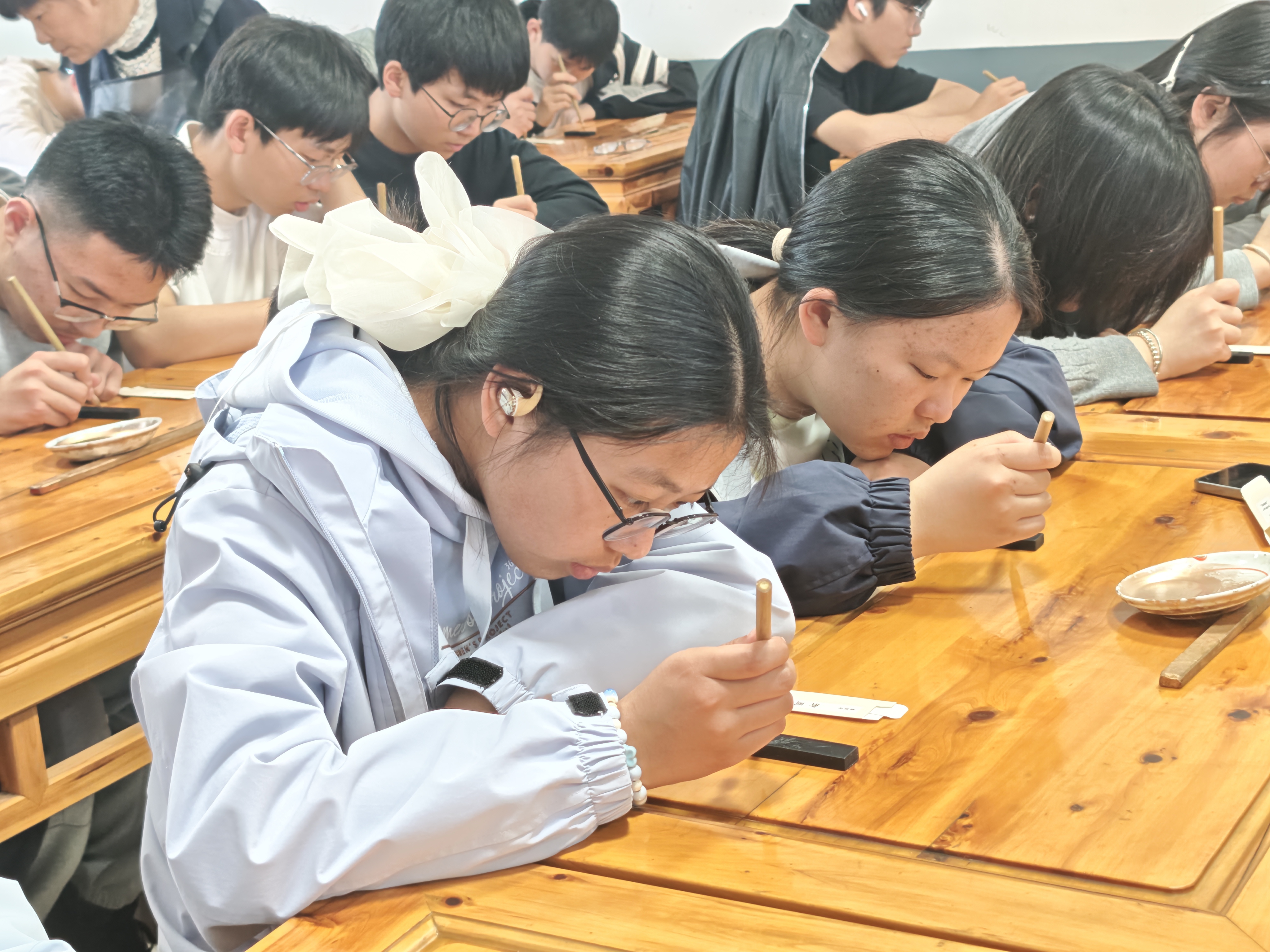 离开龙川,我们来到此行的重头戏——徽墨文化园。还未走进车间,一缕若有若无的松烟香气已扑面而来。在非遗传承人的带领下,同学们参观了徽墨制作的完整流程:炼烟——松木在密闭窑中不完全燃烧,收集的烟灰细如粉尘;和料——烟灰与冰片、麝香等药材按秘方混合,反复捶打上万次;制墨——墨坯入模压制成型,阴干半年以上;描金——墨锭晾干后,用金粉、银粉描绘图案与文字。最令同学们兴奋的,是亲手体验描金环节。每人领到一方已经成型晾干的墨锭,上面印着“徽州”“龙川”等字样。大家屏息凝神,用细毛笔蘸取金色颜料,沿着凹痕一点点填描。有的同学手一抖,金粉溢出了边界,传承人笑着安慰:“不着急,描金练的就是耐心。”二十分钟后,一块块闪着金光的墨锭在手中诞生。同学们小心翼翼地将作品装入锦盒,说要带回家珍藏。“原来‘一两徽墨一两金’不仅说它贵重,更说它凝聚了匠人千锤百炼的心血。”一位同学在研学手册上写道。