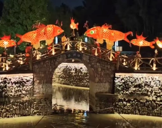 晚餐与篝火晚会结束后,我们乘车前往千年古村仁里。村口的古樟树下,早有村民举着鱼形灯笼等候。随着一声锣响,非遗渔灯巡游正式开始——龙头鱼身的“鳌鱼”打头阵,其后跟着鲤鱼、青鱼等各色鱼灯,在古村巷道中蜿蜒游走,如星河坠地。同学们跟在队伍后面,有的举起手机录像,有的忍不住伸手去摸鱼灯的尾巴。村里的老人边走边唱渔灯歌,光影摇曳间,古老的祝福穿越时空,抵达每一位少年的心中。