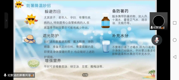 炎炎夏日,酷暑难耐。为了应对高温状况,班会第四部分主持人从防暑降温妙招与注意事项方面开展描述,拓展有关中暑的病症,介绍如何在高温环境下做好防护措施,提出应当常备防暑药品,进行遮光防晒等措施,减少因高温而生病的风险,度过一个愉快健康的暑假。