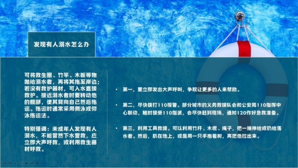 班会第一部分是通过介绍让我们对危险水域再次进行了解,这些看似美丽的外表下暗藏无数危险,它们多为野生水域,较多的水域流量较大且水情不明,水中杂质较多,少有人看管,安全无法得到保证,这些水域往往也成了溺亡多发地。古人云:水能载舟,亦能覆舟。这些水域能给人们解一时之快,但是这可能需要让我们付出连后悔都来不及的代价,可谓玩水失足千古恨,回头是岸等来生。