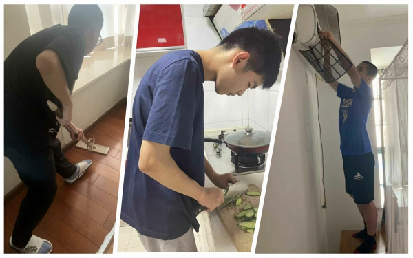 有些同学拿起抹布,洗洗烧饭的锅碗瓢盆。
