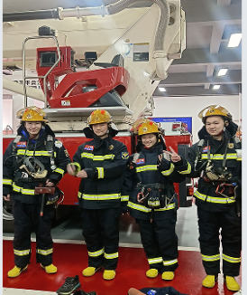 同学们跟随讲解员的步伐前往了解消防服装并解释他们与普通服装的不同和它们对应的功能,如用来保护脚部在鞋中装上的钢板、外能防火内也能贴合皮肤的衣物、考虑到伤员无法动弹的情况而设置的呼救器……在消防员的指导下,部分同学还亲自体验了穿戴消防服,和普通衣物相比,消防服极为沉重。穿戴过程繁琐不易,同学们穿上消防服后尝试爬楼梯,却感到寸步难移。虽压力与高度成为了消防员们前行路上的拦路虎,但使命与责任驱使消防员们临危不乱、英勇无畏、迎难而上!