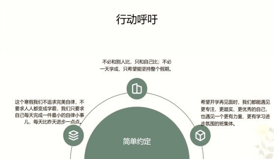 会上主持人梅颢怡同学围绕自律主题进行了精彩的班会演讲。她先带领同学们认清寒假自律的特殊性,明白自律不是勉强自己,而是用理性对自己负责,为自己立法。也找到了影响自律的常见问题,看清了它们就像前进路上的拦路虎。更结合了班级的实际情况,和大家一起反思现状,强调了自律对于班级的长远意义。会上梅颢怡同学还分享了切实可行的自律办法。让坚持不再空洞,通过这次班会同学们对自律有了更深刻的理解,也更加清楚假期该如何安排,明确了假期自律的方向,掌握了可以立即行动起来的具体做法,把自律意识转化成了可落实的实际行动,为新一年赋能。