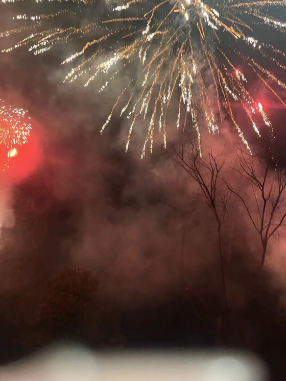 夜幕降临,同学们与家人来到院中点燃烟花。璀璨的花火划破夜空,照亮张张笑脸,噼啪的爆竹声驱散旧岁寒意,也寄托着对新年的美好期盼。