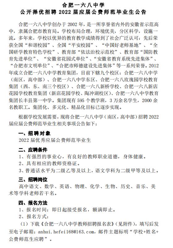 合肥一六八中学2022届公费师范生招聘公告