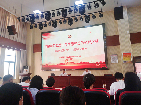 为深入学习贯彻习近平总书记“七一”讲话精神,9月15日下午,中共合肥一六八新店花园学校支部邀请中共合肥一六八中学委员会书记范守国给全体党员上了一节精彩的党课——《闪耀着马克思主义思想光芒的光辉文献——学习习近平“七一”重要讲话精神》,党课由合肥一六八新店花园学校党支部书记梁昌波主持。合肥一六八新店花园学校和合肥一六八中学教育集团陶冲湖校区全体党员参加了学习。