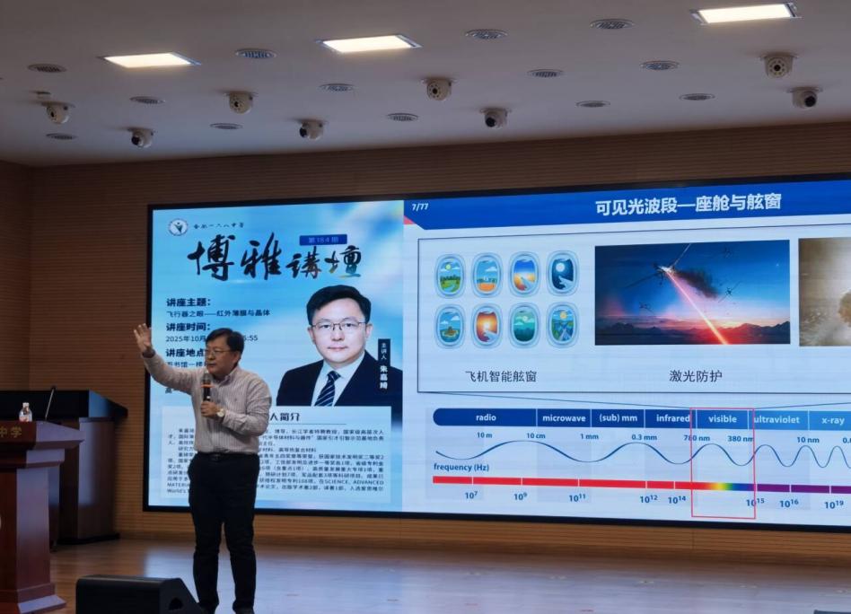 金秋十月,丹桂飘香,科创之风拂遍合肥一六八中学校园。10月16日下午,博雅讲坛再度启航,迎来一位重量级嘉宾——哈尔滨工业大学朱嘉琦教授。他以《飞行器之眼——红外薄膜与晶体》为题,为高一学子开启一场融合尖端科技与家国情怀的知识探索之旅。活动由年级部副主任陈礼庆主持。