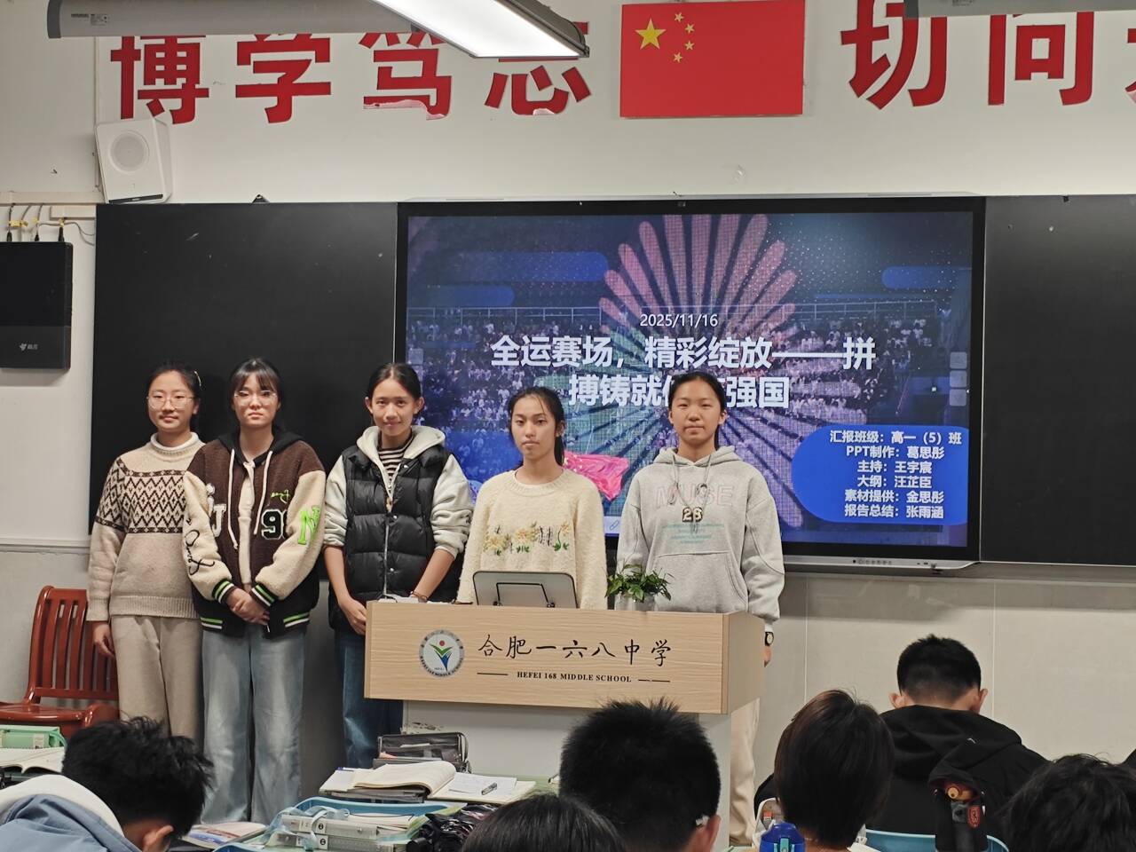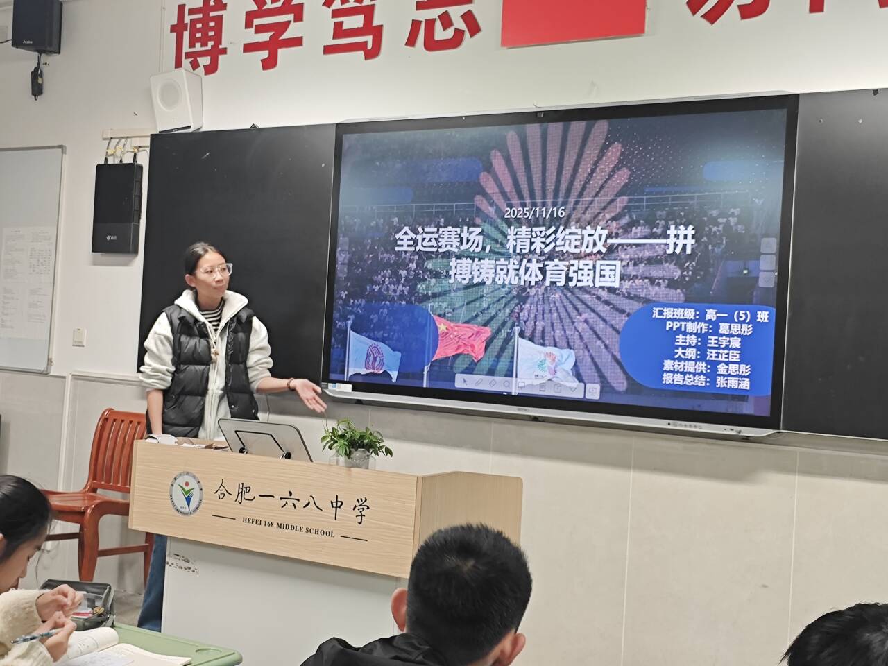 2025年第十五届全运会的赛场,正以最鲜活的方式与校园里的青春对话。11月16日晚,合肥一六八中学高一年级各班级围绕“全运赛场精彩绽放,拼搏铸就体育强国”主题开展时政评论分享会,同学们循着赛场上的青春足迹,读懂了拼搏的真谛,更明晰了青年与强国的联结。