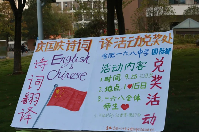 为营造出欢度国庆的喜庆气氛,激发同学们的爱国热情和英语学习兴趣,感受中华传统文化与诗词文化的独特魅力,同时锻炼同学口语表达能力,在张灯结彩中,合肥一六八中学国际部“庆国庆诗词双语主题活动”拉开了序幕。