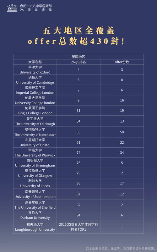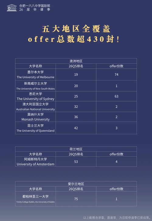 截至目前,2026届申请季合肥一六八中学国际部已累计收获430余封offer!